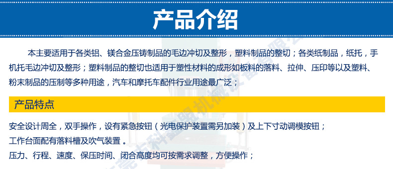 也适用于塑性材料的成形如板料的落料、拉伸、压印等以及塑料、粉末制品的压制等多种用途。